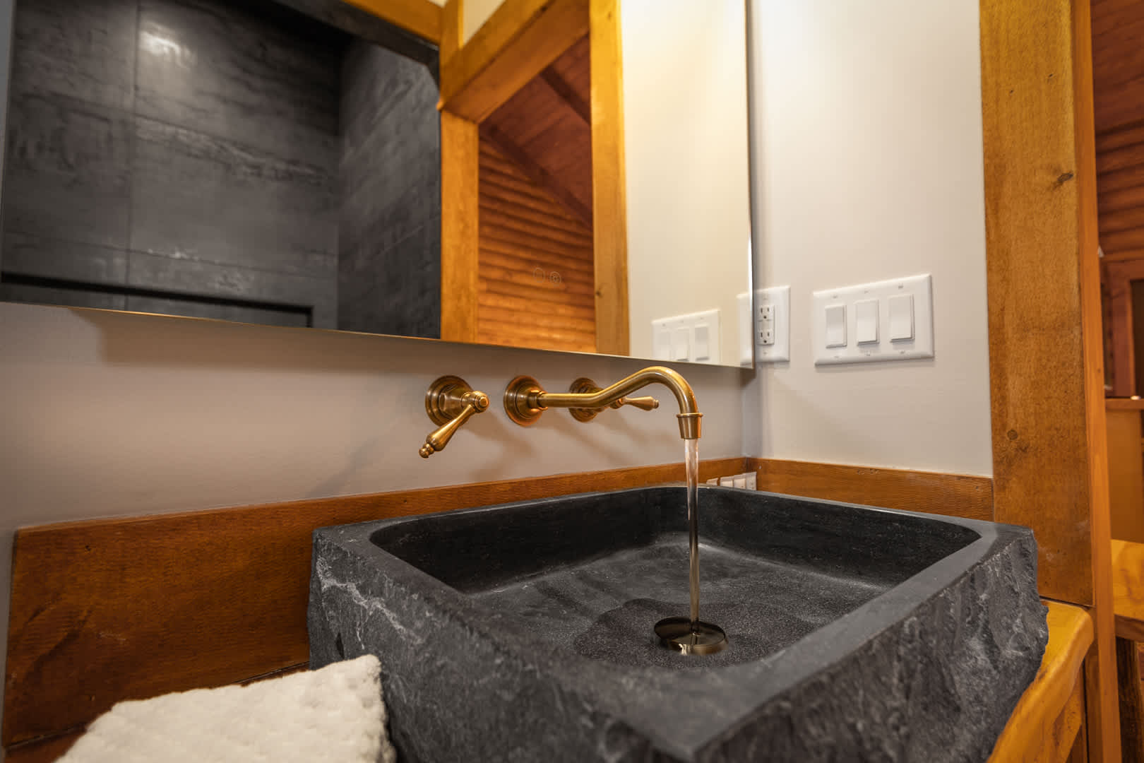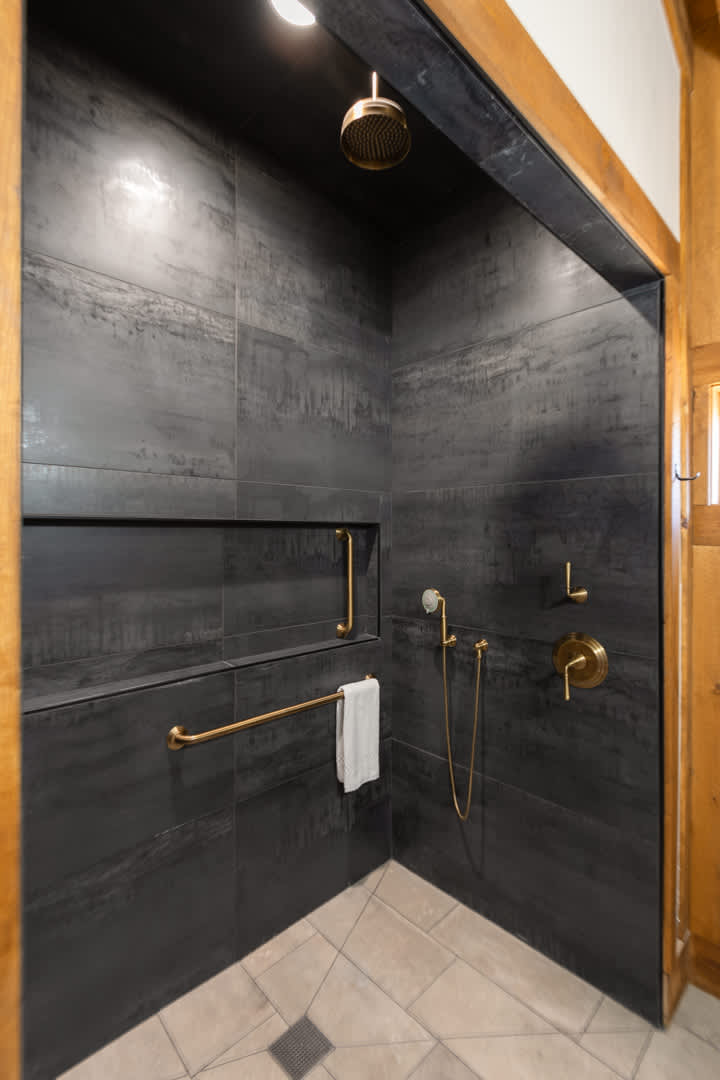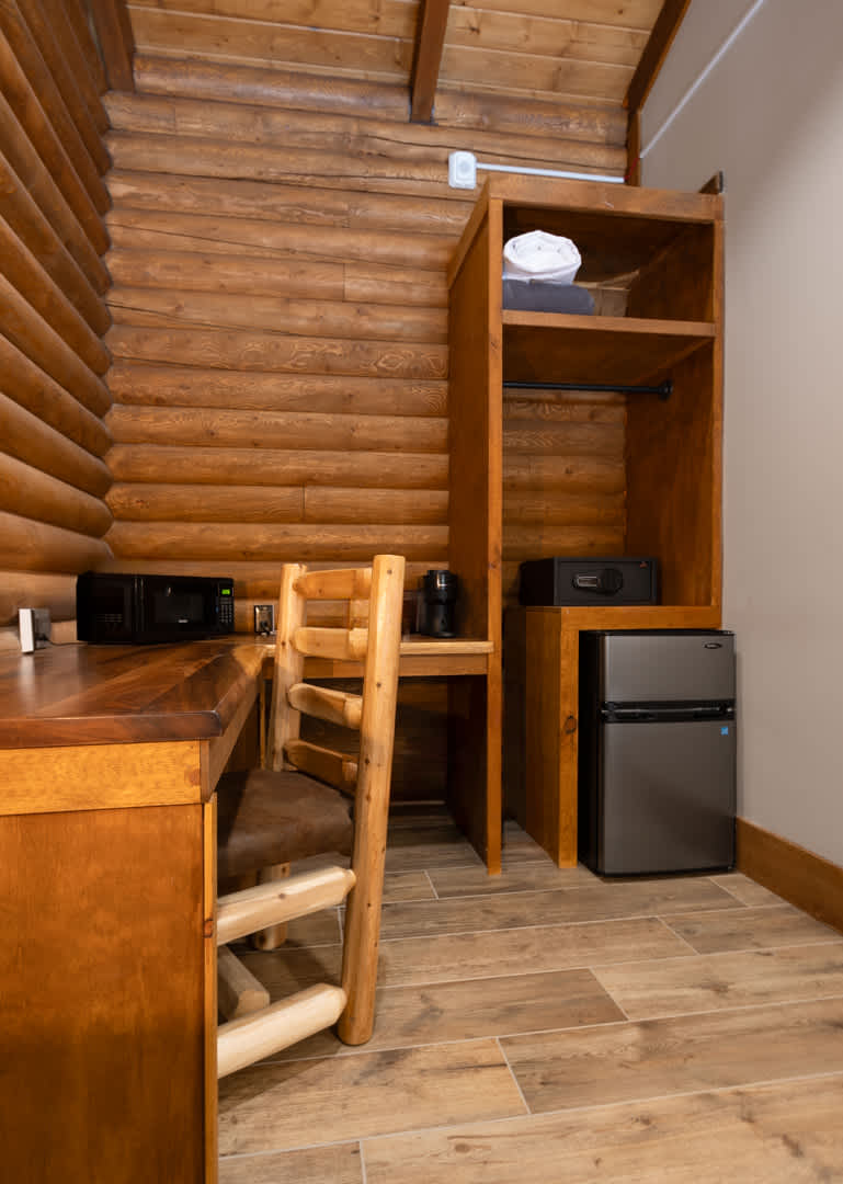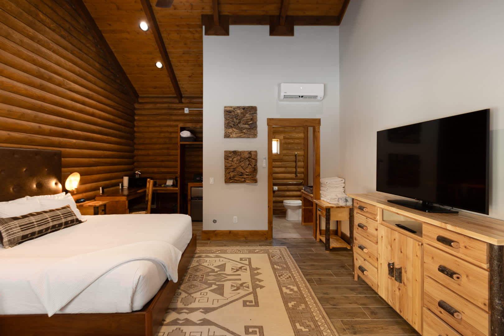 The Timber at Holly Branch’s accessible ADA Premium King Room features rich fabrics and tasteful furnishings paired with natural walls and metal details. A luxury, oversized shower with rain showerheads makes this sophisticated room a luxurious experience.